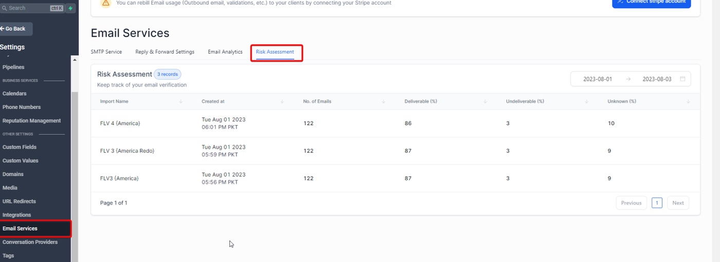 The Risk Assessment tab in Settings> Email Services> Risk Assessment will keep track of historical data for the imports regarding Email Addresses Risk Assessment.