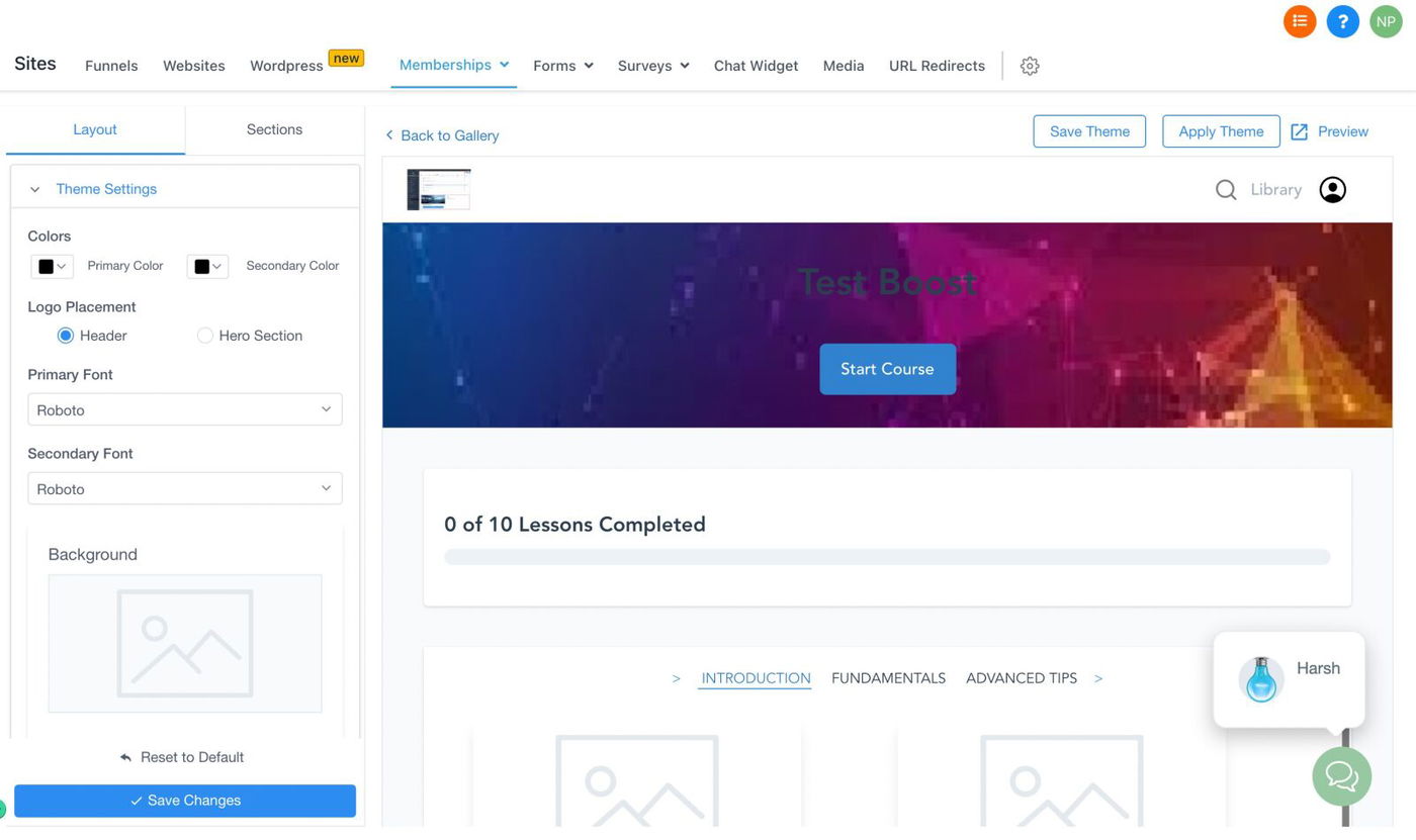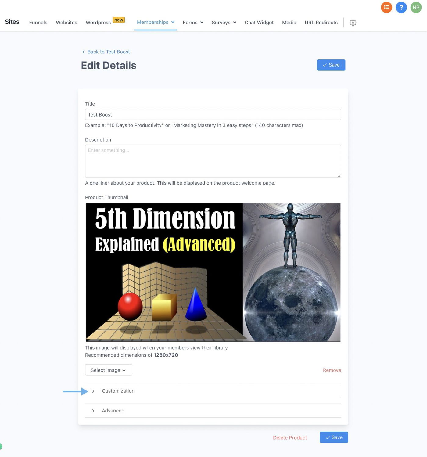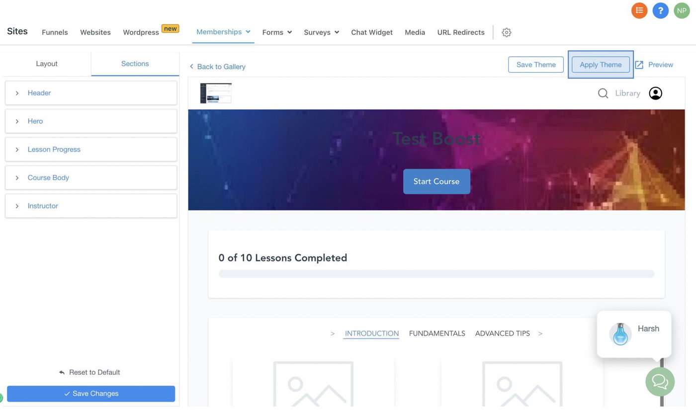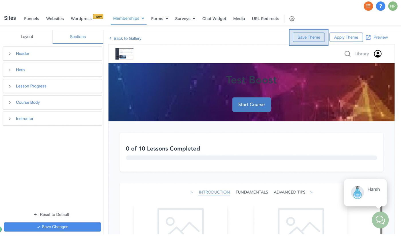 Sites->Membership->Products->Customize->Gallery>Customize>Sections—> Lesson